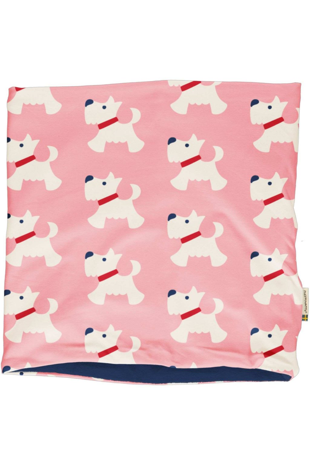 Biobavlněný zimní nákrčník pro děti s teplou velurovou podšívkou s obrázky pejska Skotiho. Nákrčník je jemný k citlivé pokožce, vhodný pro alergiky, odolný proti opotřebení, má certifikát GOTS.