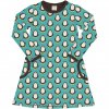 Pohodlné áčkové dívčí šaty s dlouhým rukávem a 2 obloukovými kapsami vyrobené z biobavlny. Podzimní šaty mají rukávy, kulatý výstřih a kapsy opatřené tenkým jednobarevným ozdobným lemem. Zapínání na patentkové knoflíky na levém rameni až do velikosti 86/92 pro větší pohodlí při oblékání. Dobře poslouží také jako jarní šaty.