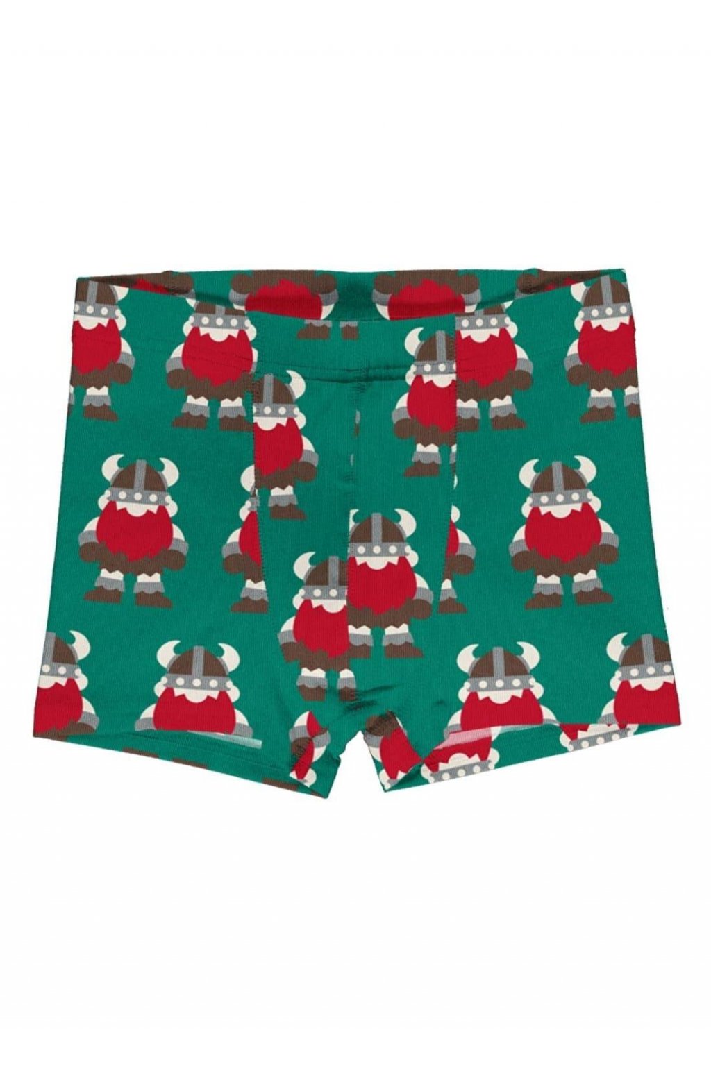 Biobavlněné zelené dětské boxerky pro kluky s obrázky bojovníků vikingů. Trenýrky jsou hypoalergenní, jemné k citlivé pokožce, poddajné a odolné.