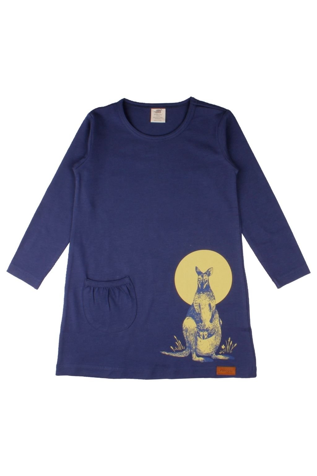 Biobavlněné tunikové šaty s dlouhým rukávem s obrázkem klokana. Tunika je jemná k citlivé pokožce, vhodná pro alergiky, odolná proti opotřebení, má certifikát GOTS.